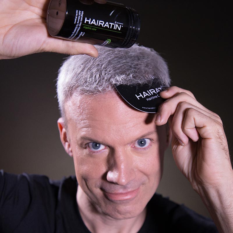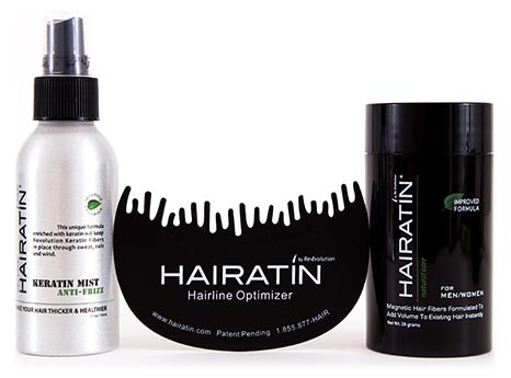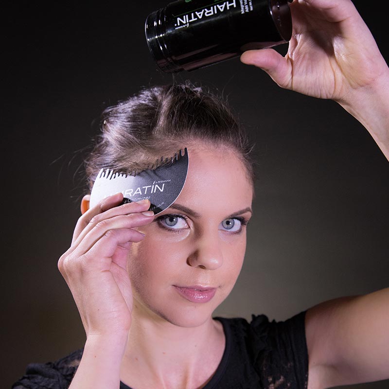 | Directions: | 1. Insert the teeth of the Hairline Optimizer into your hairline. 2. Shake Hairatin Fibers around hairline. 3. If desired, gently pat hair to disperse Hair Fibers. |
